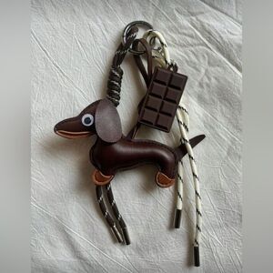 Adorable brown dachshund keychain with a chocolate charm. Perfect for dog lovers.
