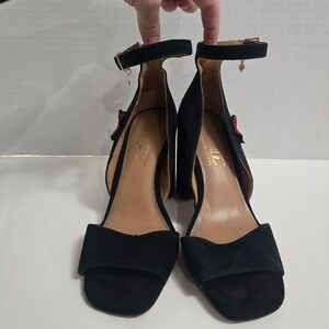 Nanette Lepore Black Suede Embroidered Block Heel Ankle Strap Sandals Women's