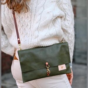 Evergreen leather foldover crossbody by Meanwhile Back on the Farm. Very good condition with removable leather strap to be used as a clutch. Measures 7.5” x 12”. Holds quite a bit.