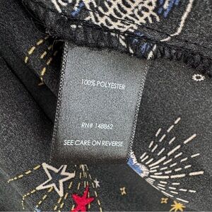 Great condition Torrid Harper Black Blouse. Heart & dagger, skulls, birds, flowers, bees and stars print. Two chest pockets. V-neck with 3 hidden buttons. Sleeves can be rolled up and buttoned. Please see all pictures!