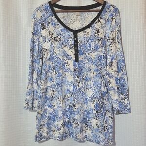 Laura Ashley Women 3/4 Sleeve Crew Neck Snap Blouse Blue Size L Buttery Soft