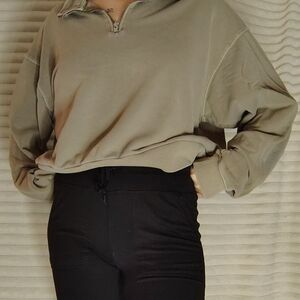 Light green pullover with a soft texture. Features a quarter-zip design. it's a little cropped but barely.