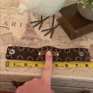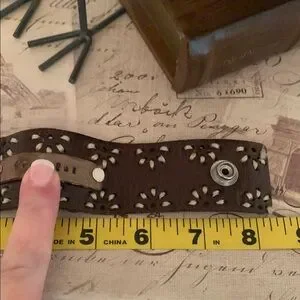 This brown leather cuff features an intricate cutout design that adds a touch of elegance to any ensemble. Crafted from high-quality leather, it offers both durability and style. The unique pattern creates a sophisticated look, making it a versatile accessory for various occasions.