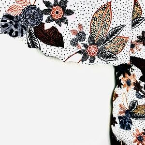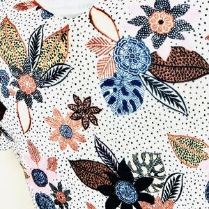 LOFT NEW Lightweight V-Neck Short Sleeve Sweater made of soft knit jersey with Lovely flutter sleeves in a botanical print of wine, blue, peach & pink flowers on an off-white speckled background.