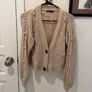 Elevate your style with this chic beige knit cardigan. Perfect for any occasion, it offers comfort and elegance. A bit of pulls.