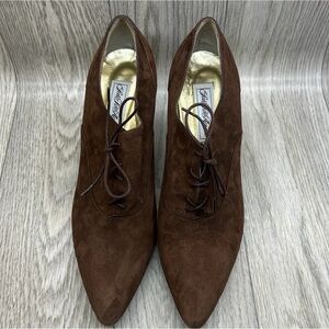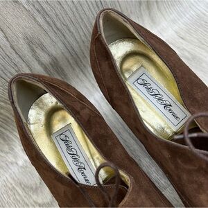Pre owned Elegant brown suede shoes with a gold interior. Perfect for any occasion. used shoes can include signs of wear such as scuffs and scratches, dust and creases from normal use, Dirt, stain or damage will be shown in photos. see all pictures as they are part of the of the description.