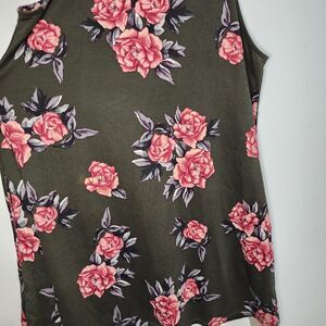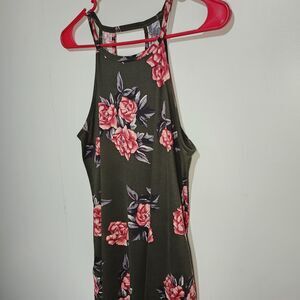 Nine Britton halter-style sleeveless mini dress featuring a flowy trapeze/shift silhouette. This dress has a round neckline with a flattering halter cut and a keyhole back closure. The dark olive background is accented with a bold pink and red floral print, giving it a feminine yet modern look. Made from a soft, lightweight, and stretchy knit blend of polyester and spandex, its comfortable for all-day wear and easy to dress up or down.