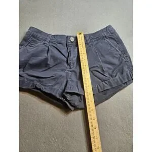 The product is a pair of Abercrombie & Fitch women's size 0 blue chino shorts with a high rise. These cuffed shorts feature a button closure, mid-rise waist, and slash pockets. Made from a cotton blend fabric, they are machine washable and suitable for casual occasions in the summer, fall, and spring seasons. The classic American style shorts are designed for regular fit and come in a solid blue color, making them perfect for activities like walking or beach outings.