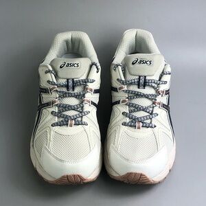 Comfortable ASICS running shoes. Cream with black accents. Durable and stylish.