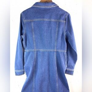 Stylish denim midi dress. Features button-down front. Long sleeves with buttoned cuffs. Two chest pockets. Perfect for casual outings.