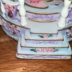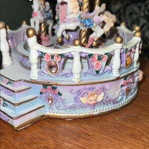 Charming pastel carousel music box with intricate details. Features pink, purple, and gold accents.