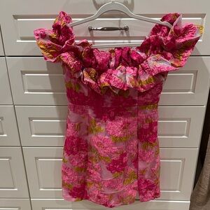 This is a Selfie Leslie Memoire Off the Shoulder Jacquard Mini Dress. Vibrant pink dress with floral patterns and ruffle details. Perfect for a stylish look.