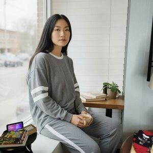 Comfortable gray long sleeve lounge set with white accents. Perfect for relaxing at home.