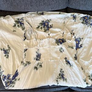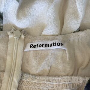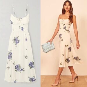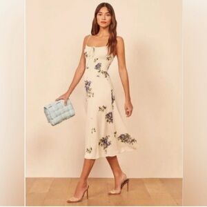 This elegant cream midi sundress by Reformation features a chic slit and delicate spaghetti straps, perfect for a wedding guest or cocktail event. The sleeveless design and light, flowy fabric make it ideal for warm weather occasions, offering a sophisticated and airy look.