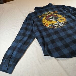 Grateful Dead Blue Plaid Flannel Shirt Skeleton Roses Graphic Womens Medium NWT