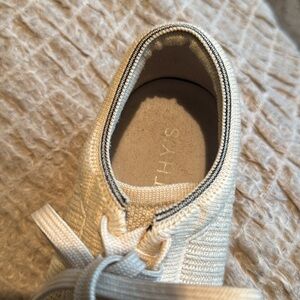 Rare limited edition Rothy’s lace-up sneakers in size 8, featuring a knit upper in soft cream and a unique speckled gum sole. This exclusive colorway is no longer available and highly sought after!