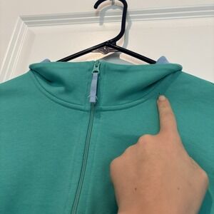 Great condition- no major rips or stains. Just a small tag hole as shown in photo. The hole would be covered if the zipper wasn't zipped all the way up.