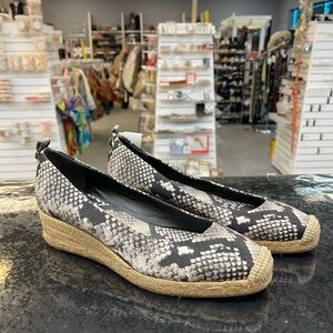 Chic espadrille flats with a stylish black and gray pattern. Perfect for casual outings.