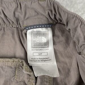 The product is a pair of boys' small gray cargo shorts by The North Face, featuring an elastic waist for added comfort and flexibility. Made of a blend of polyester and nylon, these shorts are suitable for outdoor activities like hiking and fishing, with a solid gray color and a low rise fit. They are designed with a zip closure and a flat front, making them suitable for travel, activewear, and casual occasions during the summer, fall, and spring seasons. The shorts also showcase the brand's logo and are machine washable for easy care.