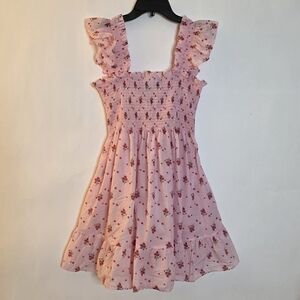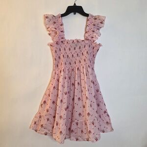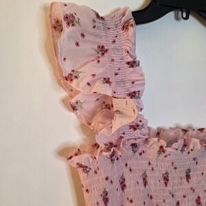 Pink Cotton mini dress with petite floral print, smocked bodice and ruffle trim. size medium. Excellent condition. Size medium.