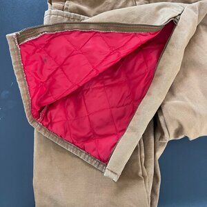 Classic Liberty insulated workwear coveralls in a durable tan cotton duck shell with quilted red lining and corduroy collar. Made in the USA with heavy-duty construction, zip front closure, and multiple utility pockets. A timeless piece of heritage workwear that fits right into rugged, utilitarian, and Americana wardrobes. Ideal for cold-weather work, outdoor use, or vintage styling.