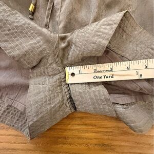 • Smocked bodice, drawstring waist, side pockets, balloon sleeves, ruffled elastic cuffs, open tie-back, gold-tone hardware.