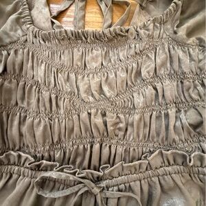 Free People, Love Grows Romper, Cassidy Romper, smocked, balloon sleeve, puff sleeve, boho, bohemian, festival, sateen, drawstring, pockets, tie back, square neck, ruffle cuff, taupe, olive, bronze, neutral, earthy, whimsical, cottagecore, indie, fall fashion, spring fashion, OB1621341, peasant sleeve, prairie, romantic, ethereal, shimmer, metallic, coquette, gorpcore lite, desert chic, western, glamping, concert outfit, photoshoot, holiday, autumn, mocha, mushroom, earth tones, elastic waist, fit and flare, mini romper, long sleeve jumpsuit, urban outfitters style, anthropologie style, vintage inspired, retro, transition piece