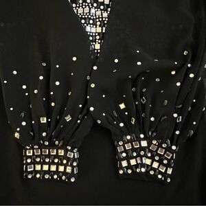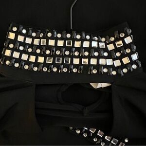 Kiki Riki Jewel Embellished Sheer Sleeve Choker Bodycon Dress, Size Medium Black- Black knit mini dress featuring a deep V chest cutout with jewel embellished high choker neck, fired jewel embellished waist, and sheer sleeves with jewels trailing from the lower arm to the cuffs. The back also has a peekaboo cutout and three button neck closure. The dress still has all of its jewels. *Please note there’s some adhesive on one of the sleeves from the manufacturing process. See the last two pictures.
