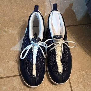 Stylish navy and white athletic sneakers. Perfect for sports and casual wear.