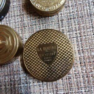 (4) Vintage / antique La Dorine Dorin Paris France compact with puff --- Mirror is spotted - see photo ---some verdigris / wear on metal - see photos with fingers pointing and on the hinge --- powder contents are very old - and not recommended to use because of age - I am selling for nostalgia / display / collecting purposes only. --- puff looks unused