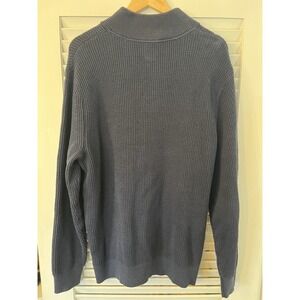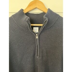 This Gap sweater is a navy blue knit pullover with a collared neckline and quarter zip closure. It has long sleeves and is made of cotton fabric. The size is XL and it is machine washable. Suitable for casual wear, this men's sweater has a regular fit and features a 1/4 zip design.