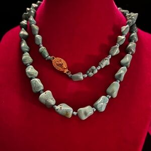 This necklace of China Mountain turquoise nuggets is 17 inches long. Handstrung by an unknown Navajo. It is a wonderful piece with the larger nuggets separated by smaller China Turquoise nuggets. The necklace is finished with the small nuggets and a vintage gold plated clasp. A beautiful piece of wearable art.