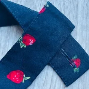 Dark navy blue color adorned all over with sweet strawberry pattern. Halter straps have three button hole options for best fit.