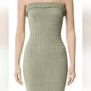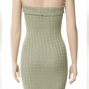 Chic strapless midi dress in a soft sage tone. Features a stylish slit for added elegance. Perfect for any occasion.