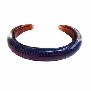 Beautiful hand-blown art glass cuff bracelet by Kevin O’Grady, signed and dated 2012. This open cuff features layered studio glass with rich cobalt blue, violet, amber, and clear tones, creating a striking depth and internal ribbed pattern that catches the light beautifully. Like wearing a work of art!