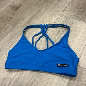Chic and supportive sports bra. Features a striking blue hue. Ideal for active wear. Used twice but in great condition. This was purchased in store on Pa’ia Maui. It was $79 new for the top only. The last 2 photos are me wearing them from previous pics. High quality surf swim top designed to have great coverage and withstand during intense sports like surfing! No padded. Strap back. Has minimal stretch. It’s meant to be tight and fitted that’s intentional to keep the girls in lol. I highly recommend looking them up online to see their quality and pricing