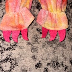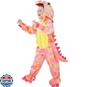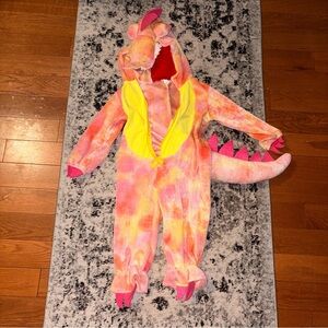 Pink and yellow T-Rex Kids costume. The costume zips up from the front.