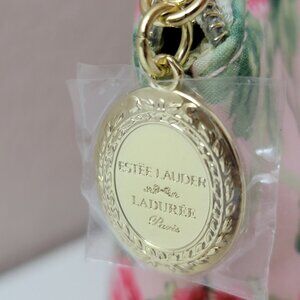Chic, feminine, and beautifully detailed. This is a limited edition Estée Lauder x Ladurée Paris cosmetic pouch featuring a soft pink floral print and a gold medallion zipper charm.