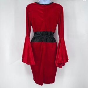 Venus red velvet bell sleeve dress with faux leather vegan tie belt and waistband, back zip closure