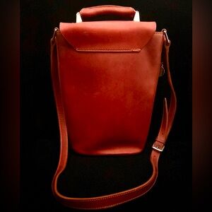 Classic Dooney & Bourke Leather Wine Bottle Bag. Rare to find in deep red. Some light fading and discoloring consistent with vintage leather. Good condition. Authentic.
