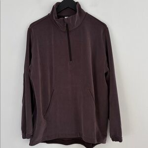 Transition from workout class to coffee shop in comfort. This oversized half zip is a little longer in the back for coverage and has a cinchable hem to adjust the look and length. Color is Sequoia. Size L.
