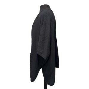 A relaxed, open-front cardigan in solid black. It's made from a lightweight, textured crinkle/waffle knit that drapes loosely. The silhouette is oversized with wide, short dolman-style sleeves and a curved hem. It features two large front patch pockets with a simple banded edge along the opening.