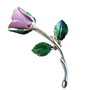 Beautiful vintage floral brooch featuring a pink enamel rose with green enamel leaves on a silver-tone stem. Classic and elegant—perfect for collectors, special occasions, or as a gift.