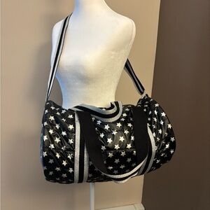 stars • star print • duffel bag • weekender bag • gym bag • travel bag • overnight bag • quilted bag • black bag • silver stars • sporty bag • adjustable strap • shoulder bag • carry on • kids bag • teen bag • dance bag • cheer bag • lightweight bag • trendy bag • athletic bag • star pattern • cute duffel • barrel bag • weekender duffel • commuter bag • yoga bag • stylish gym bag