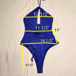 Zara halter neck bodysuit in royal blue with a floral frill design. Features a keyhole detail, back tie, front shirring, and an open back. Sleeveless, strappy one-piece design with a hidden back zipper and bottom snap closure. Lined.