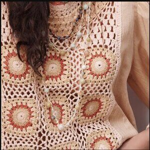 Cotton/bamboo blend oversized blouse with full sleeves that feature crochet, back nape button, and center section of granny square medallions.