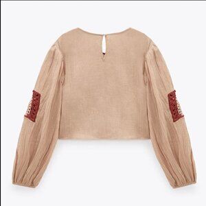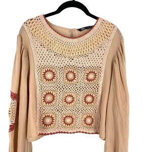Zara Granny Square Crochet Medallion Front Full Sleeve Cropped Blouse Top Beige Women's Medium