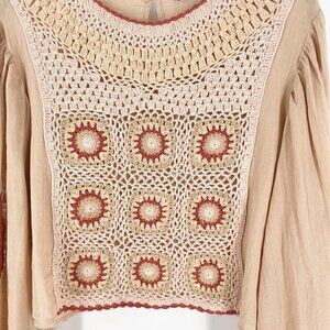 Zara Granny Square Crochet Medallion Front Full Sleeve Cropped Blouse Beige M