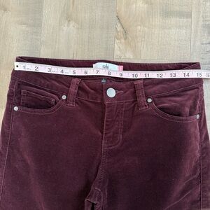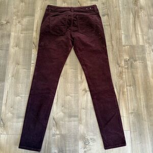Cabi Skinny Leg Corduroy Pants Women 4 Burgundy Red Fall Winter Stretch. This pair of micro ribbed corduroy pants from Cabi are the perfect piece for fall and winter. These pants are a deep burgundy purple-red color. They have great stretch to them. They feature functional pockets and are perfect to wear with boots. These are a size 4. Measurements and condition are shown in the photos.
