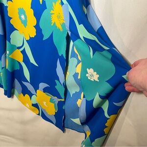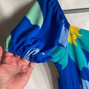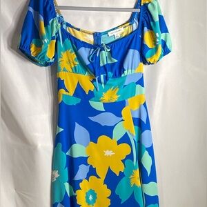 Chic and colorful midi dress by Onetheland. Features a vibrant blue and yellow floral pattern. Perfect for adding a pop of color to your wardrobe. Can dress up or wear casual. Size Small/only wore once/comes from a nonsmoking home.